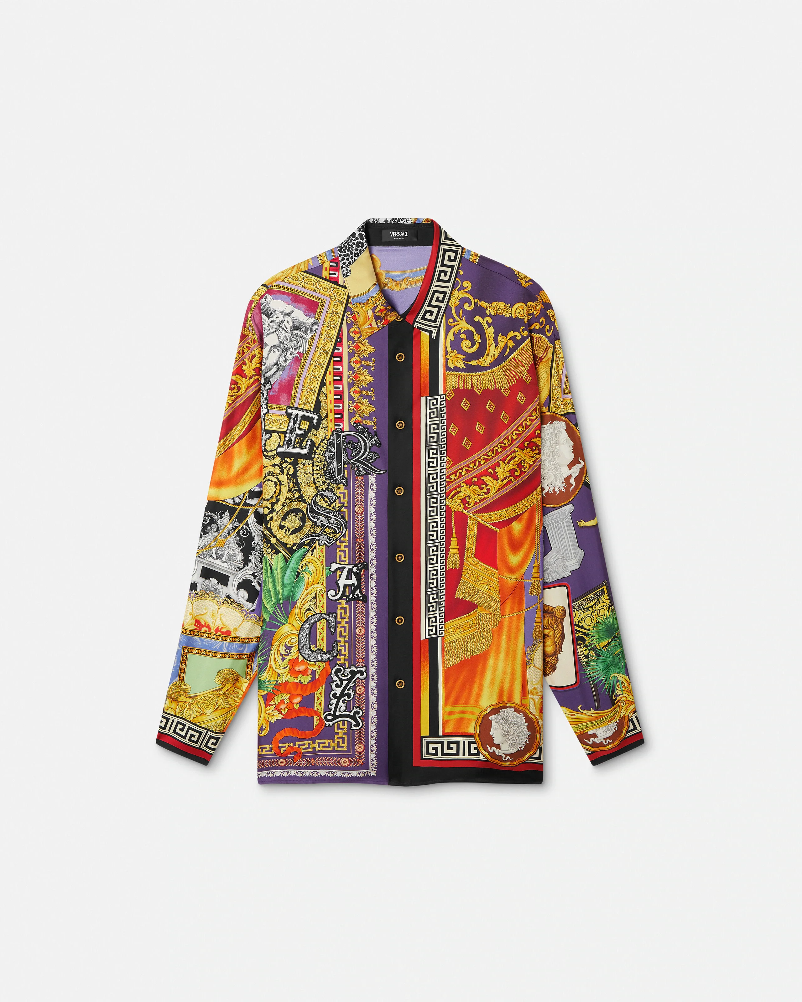 A long-sleeved regular-fit shirt in silk twill featuring accent enamel Medusa buttons and a Versace Patchwork print, depicting a collage of archival House prints. - Versace Patchwork print - Medusa hardware - Long sleeves - Pointed collar - Front button closure - Buttoned cuffs - Outer composition: 100% Silk Item: 1019438-1A16396_5X000
