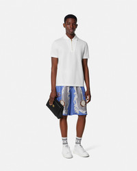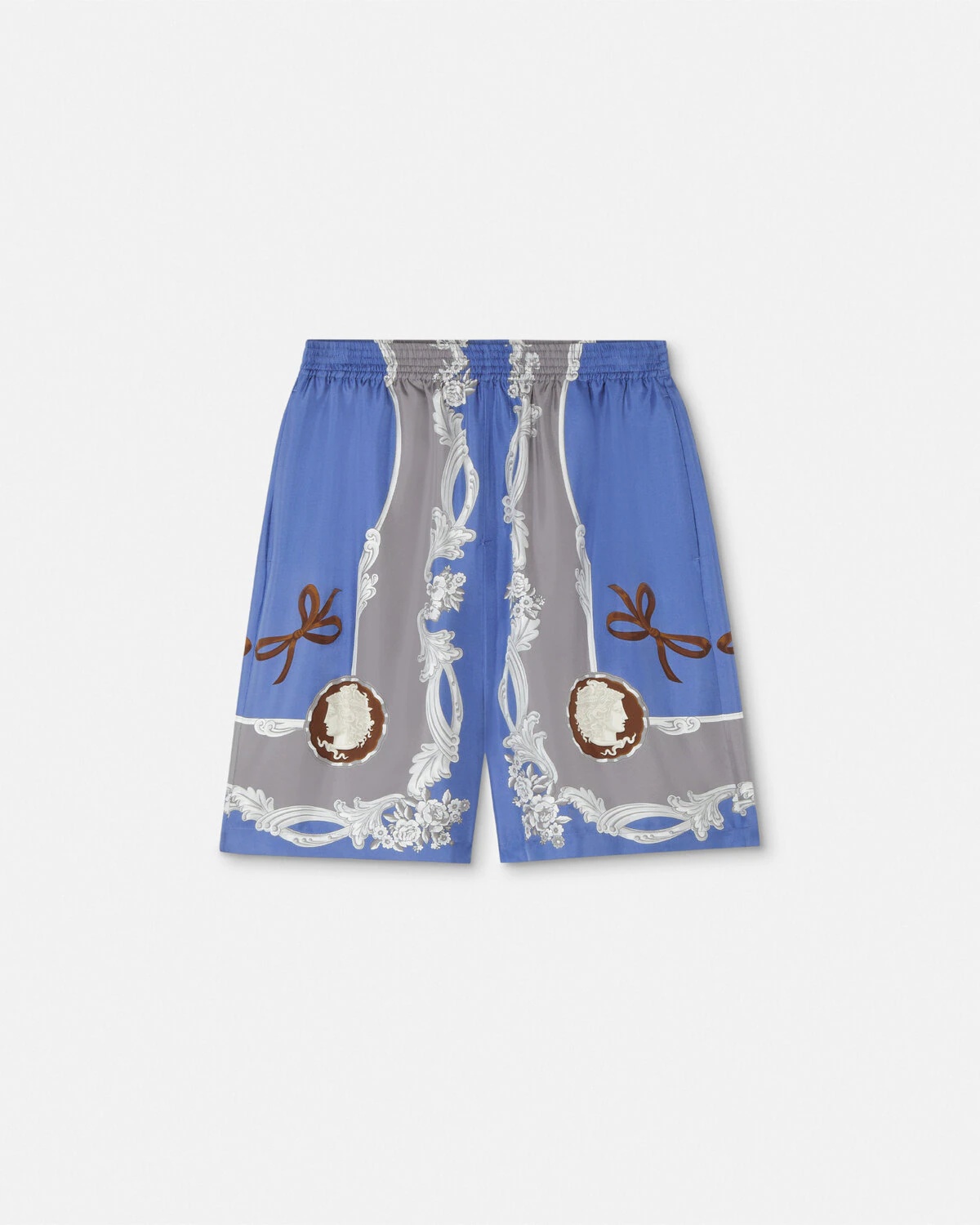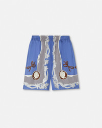 DETAILS Kneelength loosefit shorts crafted from pure silk twill featuring a Medusa Cameo print - Medusa Cameo print - Side pockets - Back welt pocket - Elastic waistband - Outer composition: 100% Silk - Lining: 100% Cupro Item: 1002476-1A14187_5UE30 SIZE & FIT - The model is 6'2" / 1.87 m tall and wears size 48 IT