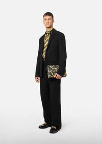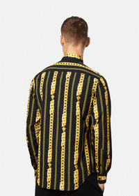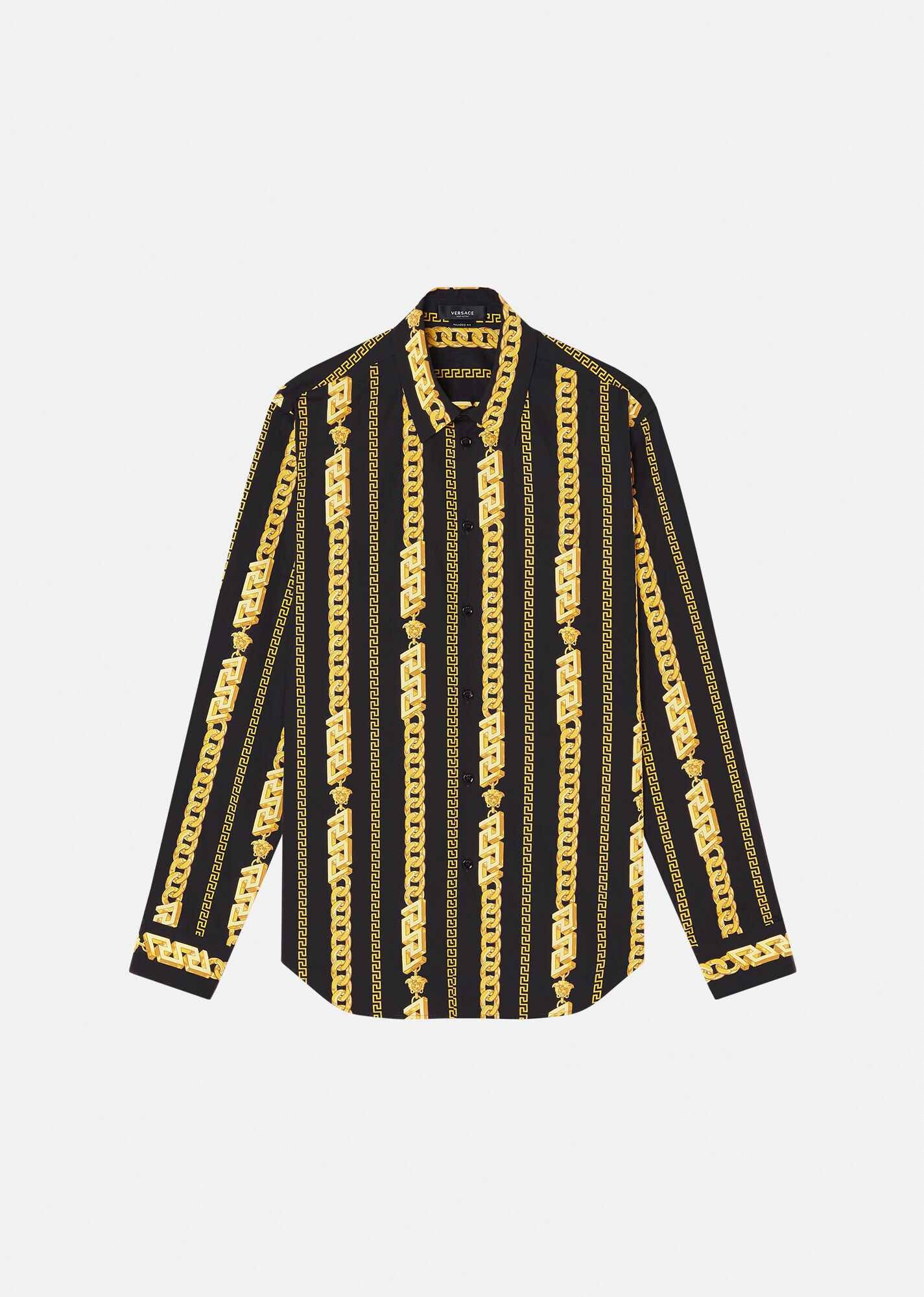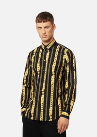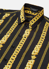 Taking a very Versace approach to a staple piece, this shirt features a classic silhouette. The button down design is embellished with the Chain Pinstripe print. DETAILS & CARE - Chain Pinstripe print - Collar - Button down front - Outer fabric: 100% Cotton - Cool iron on reverse with damp cloth on top - Do not bleach - Do not dry clean - Do not tumble dry - Machine wash cold (delicate) - Wash inside out SIZE & FIT - Palazzo fit - All sizes fit Italian standards - The Model is 1,89 m and wears a size 39