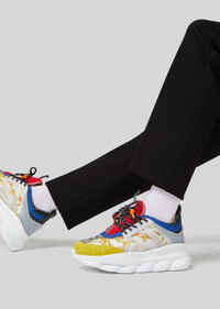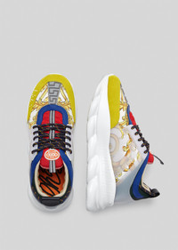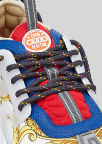 The Chain Reaction, a sneaker that embodies the strongest elements of the Versace identity - including the Gold Hibiscus print. Eclectic details create a one-of-a-kind shoe characterized by a lightweight, chain-linked rubber sole that takes inspiration from iconic Versace chain jewellery. Signature elements on the newest Versace sneaker include the iconic Greek Key pattern, the 'Chain Reaction' logo patch and braille 'love' lettering expressing the concept that love is blind. DETAILS & CARE - Gold Hibiscus print - Grey rubber dipped laces - Chain link outsole - Braille 'love' lettering - Top stitch - Cupped insole - Central Greek Key print - White Mid foot Greca Cage - Chain Reaction Logo packaging - Rubber Chain Reaction logo on upper tongue - Mesh accents on upper - 100% Polyester - 100% Leather (trim) - 80% Nylon 20% Elastane (lining) - Rubber sole - Do not machine wash - Made in Italy