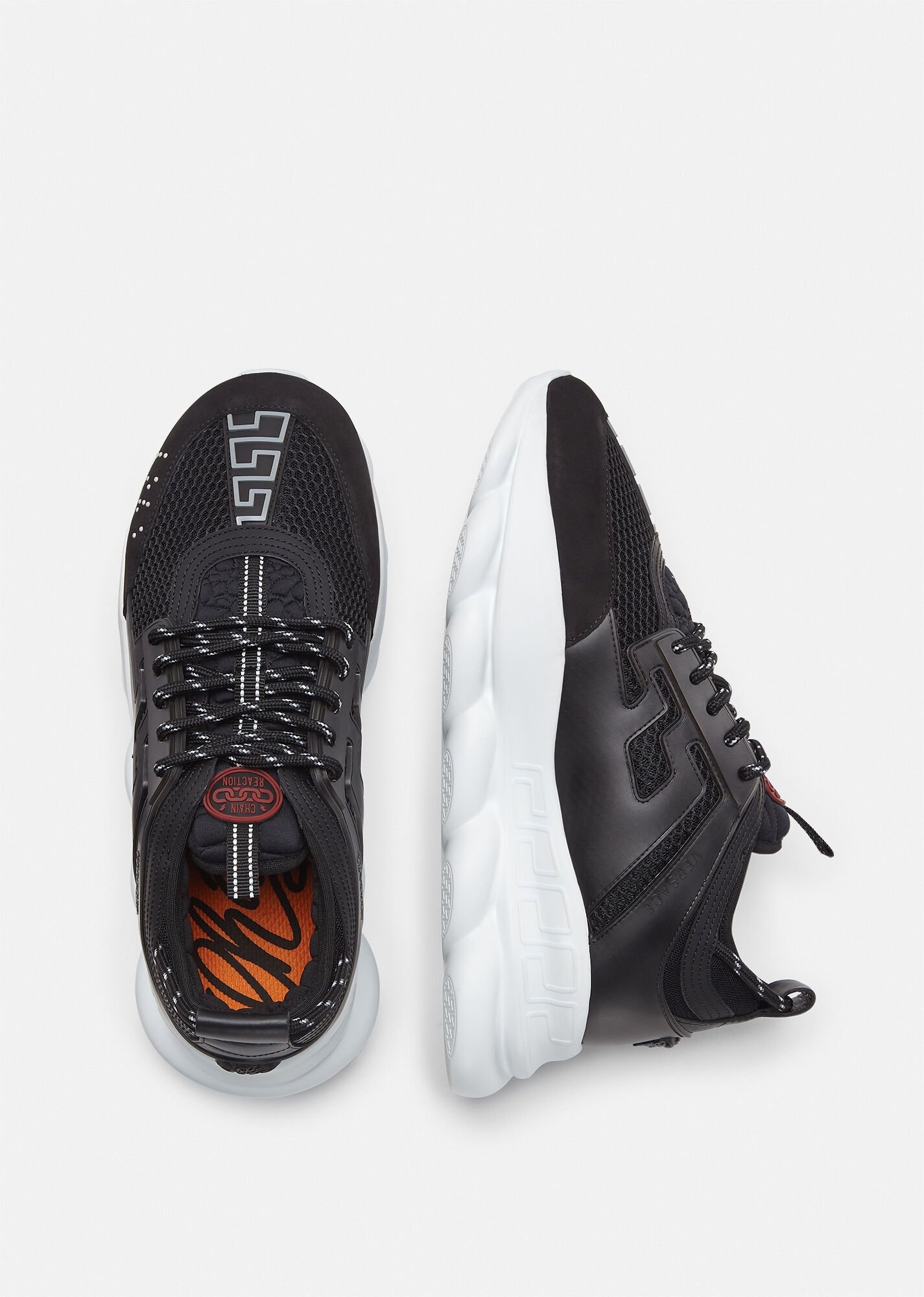The Chain Reaction, a sneaker that embodies the strongest elements of the Versace identity. Eclectic details create a one-of-a-kind shoe characterized by a lightweight, chain-linked rubber sole that takes inspiration from iconic Versace chain jewellery. DETAILS & CARE - Black color - Rubber dipped laces - Black laces - Chain link outsole - Braille 'love' lettering - Top stitch - Cupped insole - Central Greek Key print - Black Mid foot Greca Cage - Chain Reaction Logo packaging - Rubber Chain Reaction logo on upper tongue - Mesh accents on upper - 100% Polyester - 100% Calf Leather (Trims) - 90% Polyester, 10% Spantex (Lining) - Do not machine wash - Made in Italy SIZE & FIT - All sizes fit Italian standards - Fits true to size, take your normal size