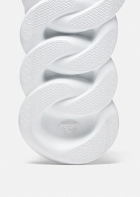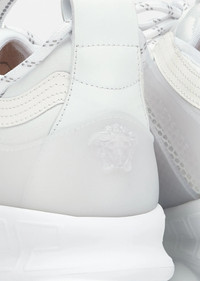 The Chain Reaction, a sneaker that embodies the strongest elements of the Versace identity. Eclectic details create a one-of-a-kind shoe characterized by a lightweight, chain-linked rubber sole that takes inspiration from iconic Versace chain jewellery. Signature elements on the newest Versace sneaker include the iconic Greek Key pattern, the 'Chain Reaction' logo patch and braille 'love' lettering expressing the concept that love is blind. DETAILS & CARE - Rubber dipped laces - Chain link outsole - Braille 'love' lettering - Top stitch - Cupped insole - Central Greek Key print - Mid foot Greca Cage - Chain Reaction Logo packaging - Rubber Chain Reaction logo on upper tongue - Mesh accents on upper - 100% Polyester - 100% Leather (trim) - 90% Polyester 10% Spandex (lining) - Rubber sole - Do not machine wash - Made in Italy SIZE & FIT - All sizes fit Italian standards - Fits true to size, take your normal size