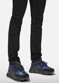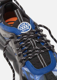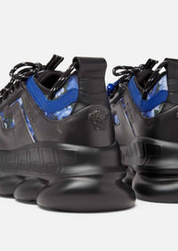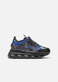 The Chain Reaction, sneakers that embody the strongest elements of the Versace identity - including the new Baroccoflage print. Eclectic details create a one-of-a-kind shoe characterized by a lightweight, chain-linked rubber sole that takes inspiration from iconic Versace chain jewelry. Signature elements on the style include the iconic Greca pattern, the 'Chain Reaction' logo patch and braille 'love' lettering expressing the concept that love is blind. DETAILS & CARE - Baroccoflage print - Rubber dipped laces - Chain link outsole - Braille 'love' lettering - Top stitch - Cupped insole - Central Greca - White Mid foot Greca Cage - Chain Reaction Logo packaging - Rubber Chain Reaction logo on upper tongue - Mesh accents on upper - Upper: 100% Nylon - Insole 1: 100% Polyester - Insole 2: 90% Polyester 10% Elastane - Insole 3: 100% Calf leather - Trim 1: 100% Calf leather - Trim 2: 90% Polyester 10% Elastane - Sole: 100% Rubber - Made in Italy SIZE & FIT - All sizes fit Italian standards - Fits true to size, take your normal size