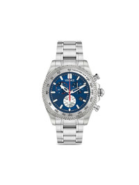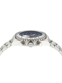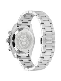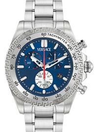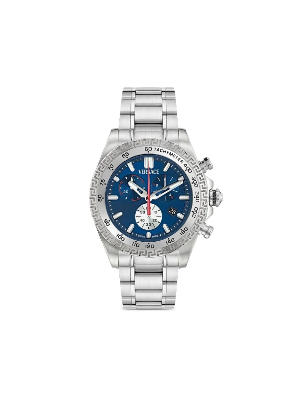 Chrono X 44mm Highlights - 45mm - Stainless steel case - Quartz movement - Round face - Baton dial - Baton hands - Chronograph counters - Date indication - Sapphire-crystal glass - Fixed tachymeter bezel - Signature engraved greca detailing - Screw-down crown - Two chronograph pushers - Stainless steel link bracelet - Butterfly clasp fastening - Water resistance up to 50m/5 atm Imported Composition Sapphire Crystal 100%, stainless steel 100% SIZE & FIT Measurement DIAMETER 1.77 in(4.5 cm)