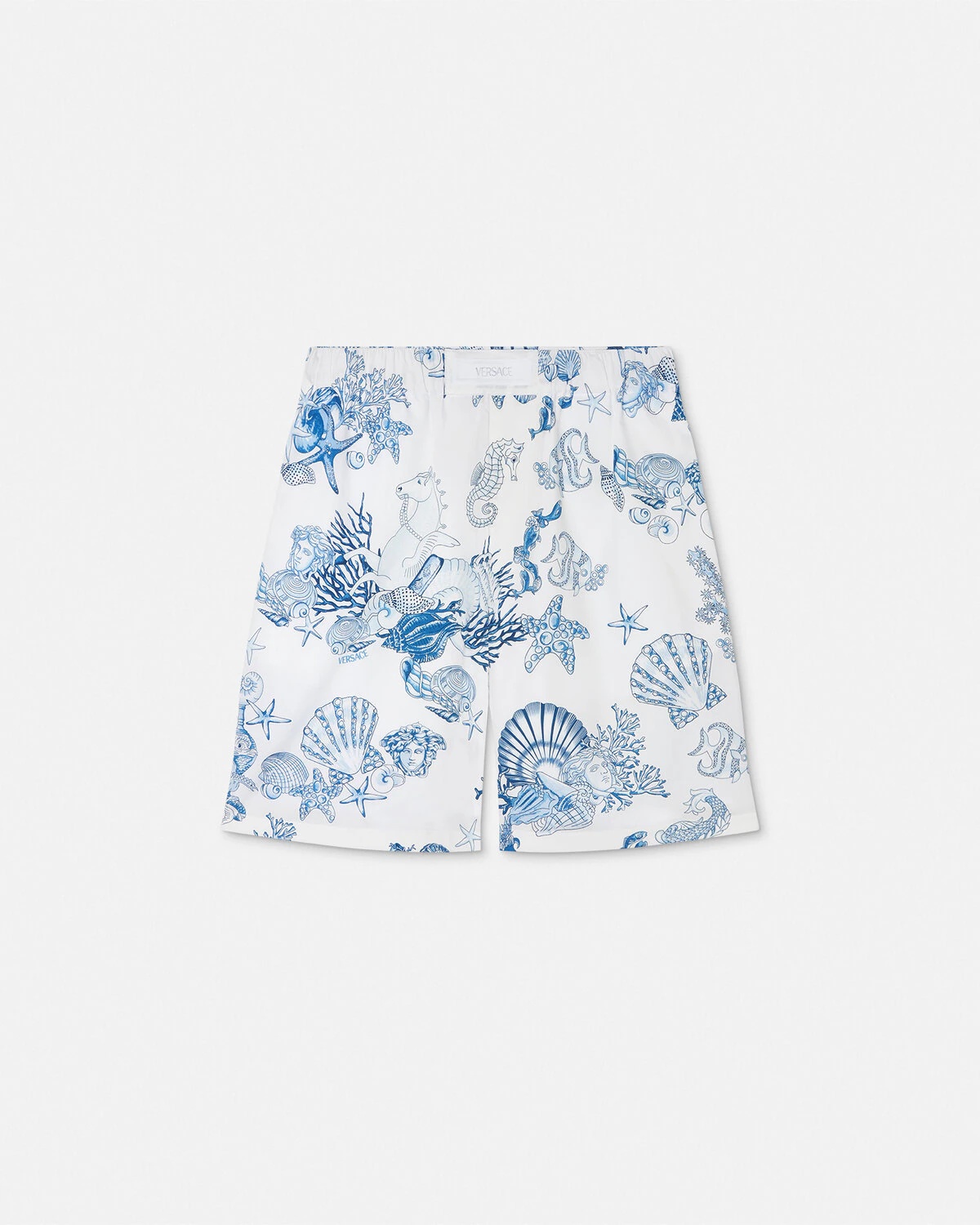 DETAILS Cotton poplin shorts featuring a Coral Theatre Allover print and a tonal jacquard Versace label on the elastic waistband - Coral Theatre Allover print - Versace Logo label - Side pockets - Back patch pocket - Elastic waistband - Fully lined - Outer composition: 100% Cotton - Lining: 100% Cotton Item: 1015924-1A15385_5W910
