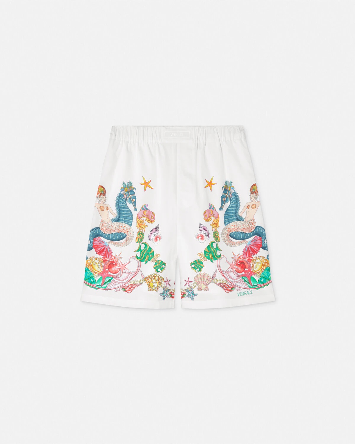 DETAILS Cotton poplin shorts featuring a Coral Theatre print depicting corals seashells and mermaids with theatrical elements reflecting the Houses connection to the dramatic artsThe style is complete with a tonal jacquard Versace label on the elastic waistband - Coral Theatre Allover print - Versace Logo label - Side pockets - Back patch pocket - Elastic waistband - Fully lined - Outer composition: 100% Cotton - Lining: 100% Cotton Item: 1015924-1A15074_5X750