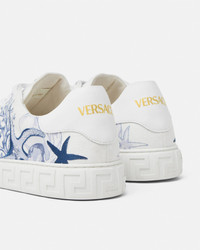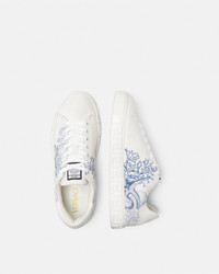 The low-top silhouette is characterized by an engraved Greca pattern on the soles and features a Coral Theatre Allover print with sequin embellishments on canvas uppers. A Versace Logo stamp on the back accents the style. Greca sneakers are made using responsible materials with certified recycled content and/or are derived from renewable origin. - Coral Theatre Allover print - Versace Logo patch at the tongue - Versace Logo at the heel counter - Low top - Lace up - Outer composition: 100% Cotton - Lining 1: 100% Polyester - Lining 2: 100% Cotton - Trim: 100% Nylon - Sole: 100% Thermoplastic polyurethane Size & Fit - The shoe weighs approximately 17.7 oz / 0.5 kg for the model size 44 IT - Footbed: comfortable - Fits true to size, take your normal size Item: 1014460-1A14951_6WH30