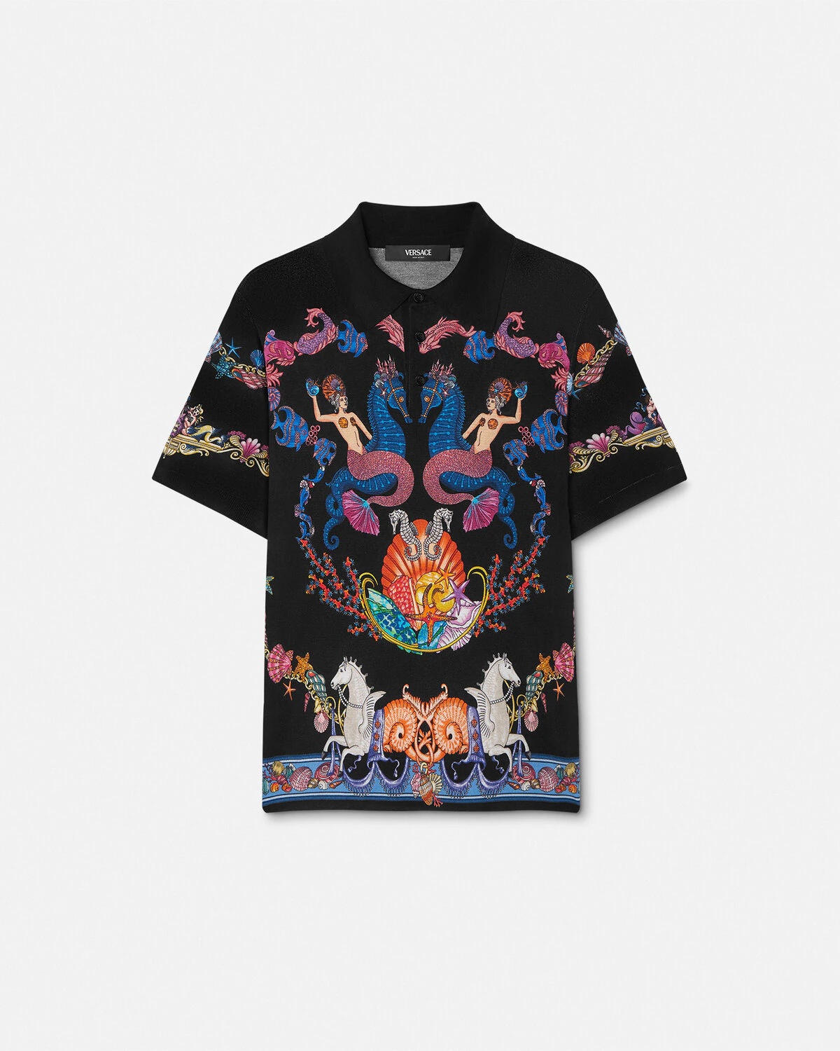 DETAILS This shortsleeved polo shirt is knit from silk and features a Coral Theatre print depicting corals shells and mermaids with theatrical elements reflecting the Houses connection to the dramatic arts - Coral Theatre print - Short sleeves - Pointed collar - Three-button placket - Ribbed trims - Outer composition: 100% Silk Item: 1019818-1A14530_5B020