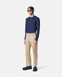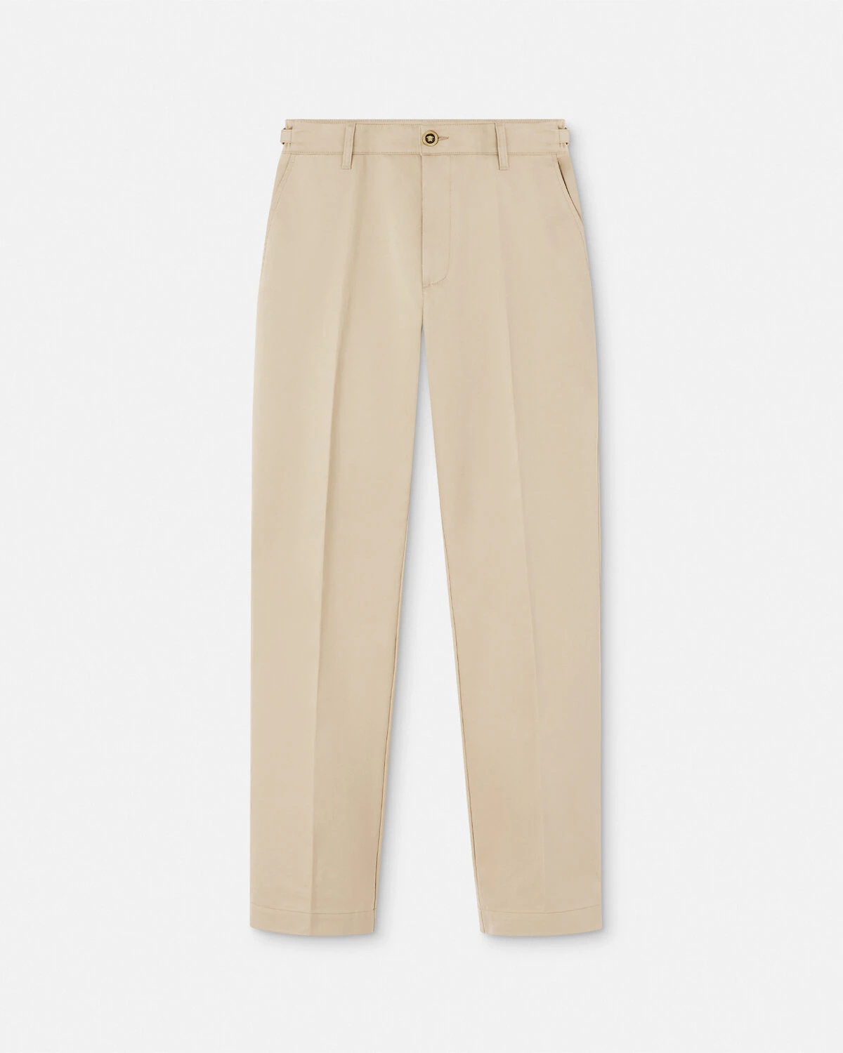 DETAILS Cotton gabardine trousers in a tapered fit featuring Medusa Biggie adjustable straps at the waistline and an accent enamel front button. - Medusa Biggie hardware - Medusa hardware - Front zip and button closure - Side pockets - Back welt pockets - Belt loops - Outer composition: 100% Cotton - Embroidery: 80% Viscose, 20% Polyester - Lining: 100% Cotton Item: 1010583-1A01718_1KD40 SIZE & FIT - The model is 5'8" tall and wears size 38 IT