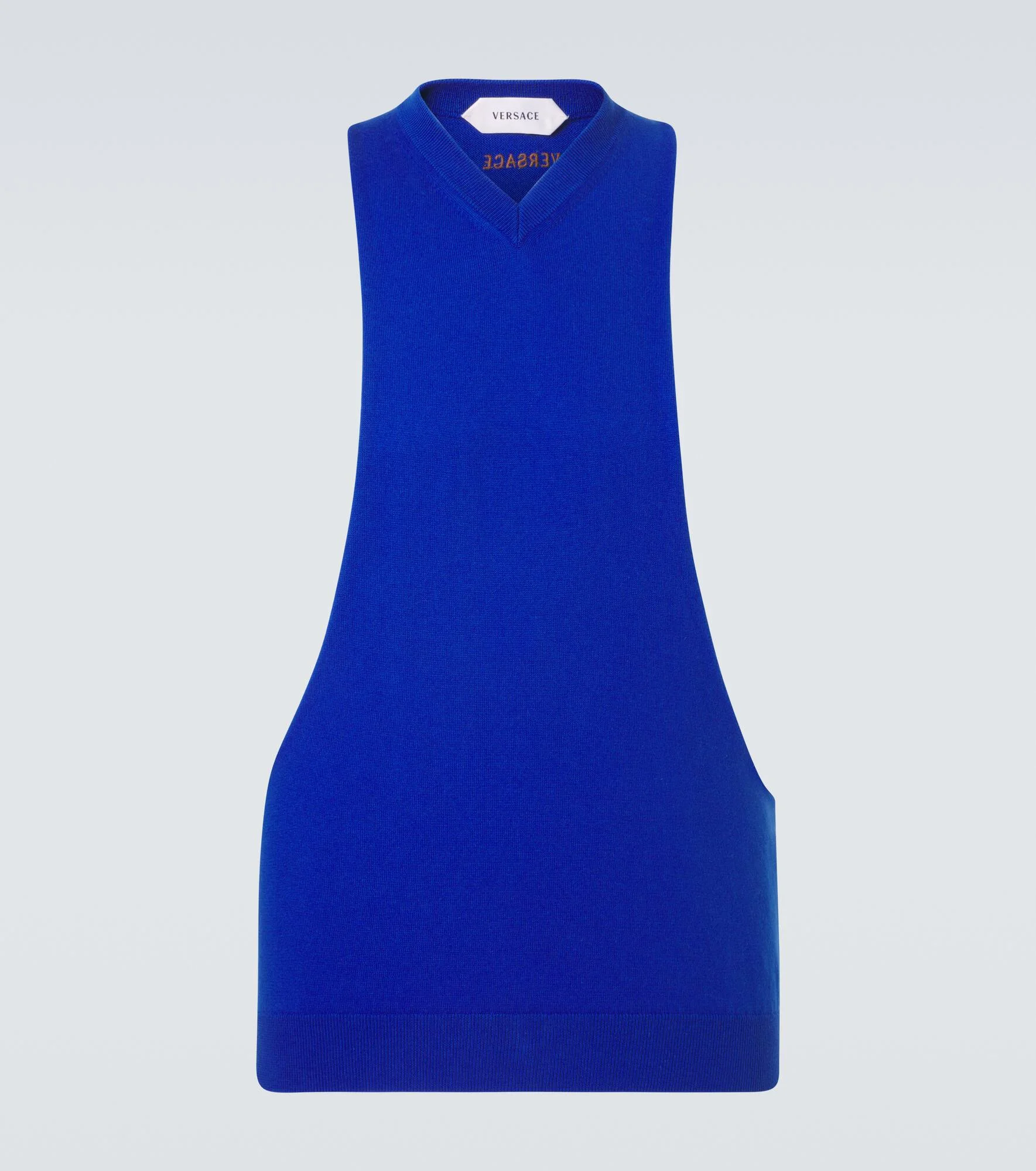 There’s no disputing Versace’s status as one of the industry’s most revered brands. This tank top is carefully crafted in Italy from cotton and boasts a V-neckline and a ribbed-knit hemline. Product Details - Material: 100% cotton - Care instructions: dry clean - Made in Italy - Color: blue - Designer color name: Lapis - Embroidery: 100% polyester - Trim: 85% cotton, 10% polyamide, 5% elastane - Collar: V-neck - Hem: ribbed - Item number: P01149587 Size & Fit - True to size - Designed for a loose fit - Stretchy fabric - Falls to the hip - The model in the picture is 185cm-6'1" and wearing a size IT 50