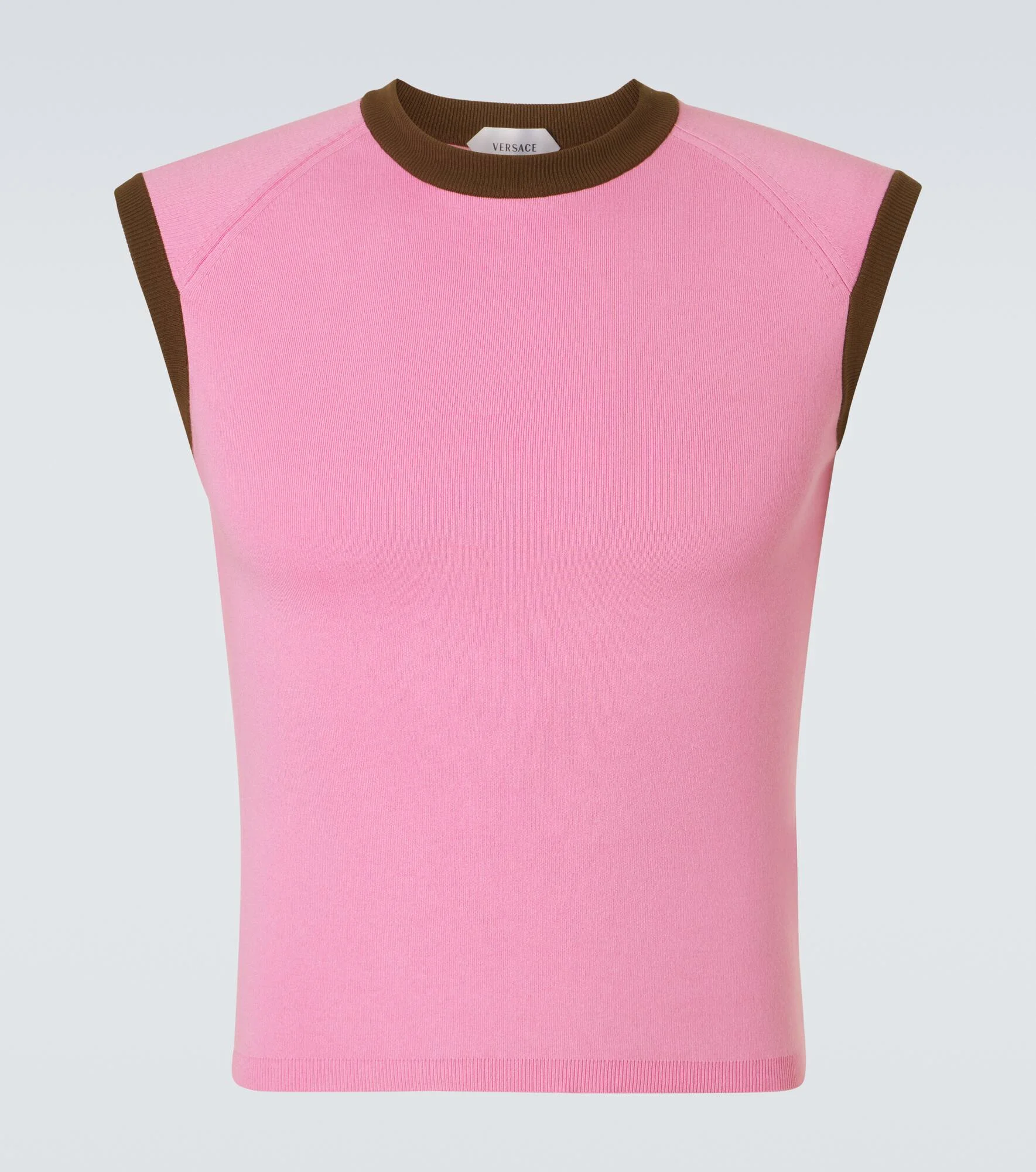 This tank top from Versace is knitted from cotton yarn. The slightly cropped design has contrasting trims around the neck and armscyes. Product Details - Material: 99% cotton, 1% other fibers - Care instructions: dry clean - Made in Italy - Color: pink - Designer color name: Pink Paradise - Trim: 89% cotton, 8% nylon, 3% elastane - Collar: crewneck - Item number: P01149575 Size & Fit - True to size - Slim fit - Stretchy fabric - Slightly cropped - The model in the picture is 185cm-6'1" and wearing a size IT 50