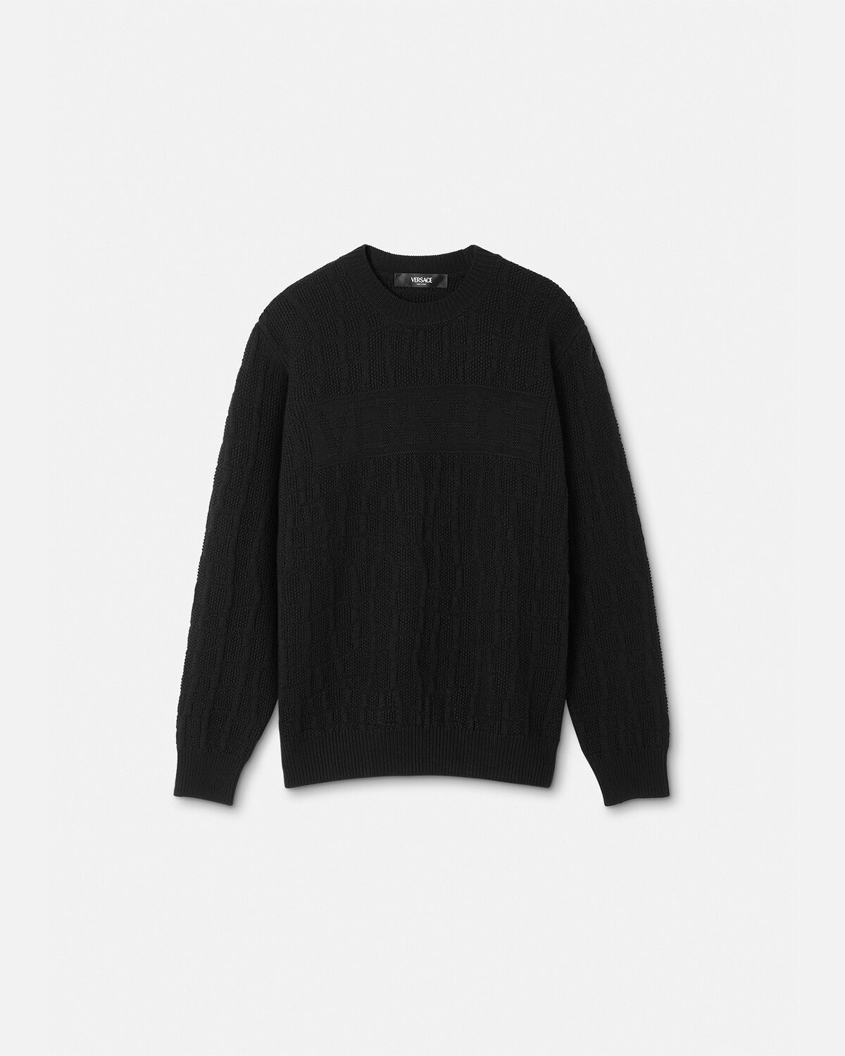 DETAILS A woolknit crewneck jumper featuring a tonal logo motif and jacquard crocodile pattern throughout - Versace logo motif - Long sleeves - Ribbed crewneck, hem, and cuffs - Outer composition: 100% Wool Item: 1012225-1A08653_1B000 SIZE & FIT - All sizes fit Italian standards