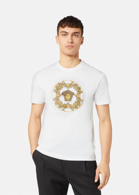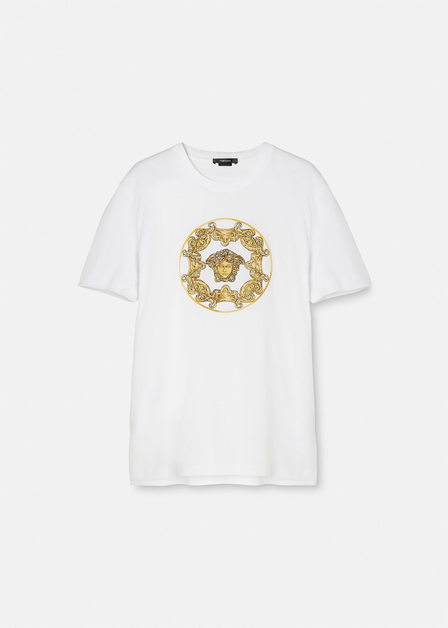 This cotton t-shirt is embellished at the front with crystals forming the Medusa. DETAILS & CARE - Crystal Medusa motif - Crew neck - Short-sleeve - Outer fabric: 100% Cotton - Trim: 100% Cotton - Embroidery: 50% Calf Leather 50% RAR - Cool iron - Delicate dry clean - Do not bleach - Tumble dry low - Machine wash warm SIZE & FIT - Taylor Fit - All sizes fit Italian standards