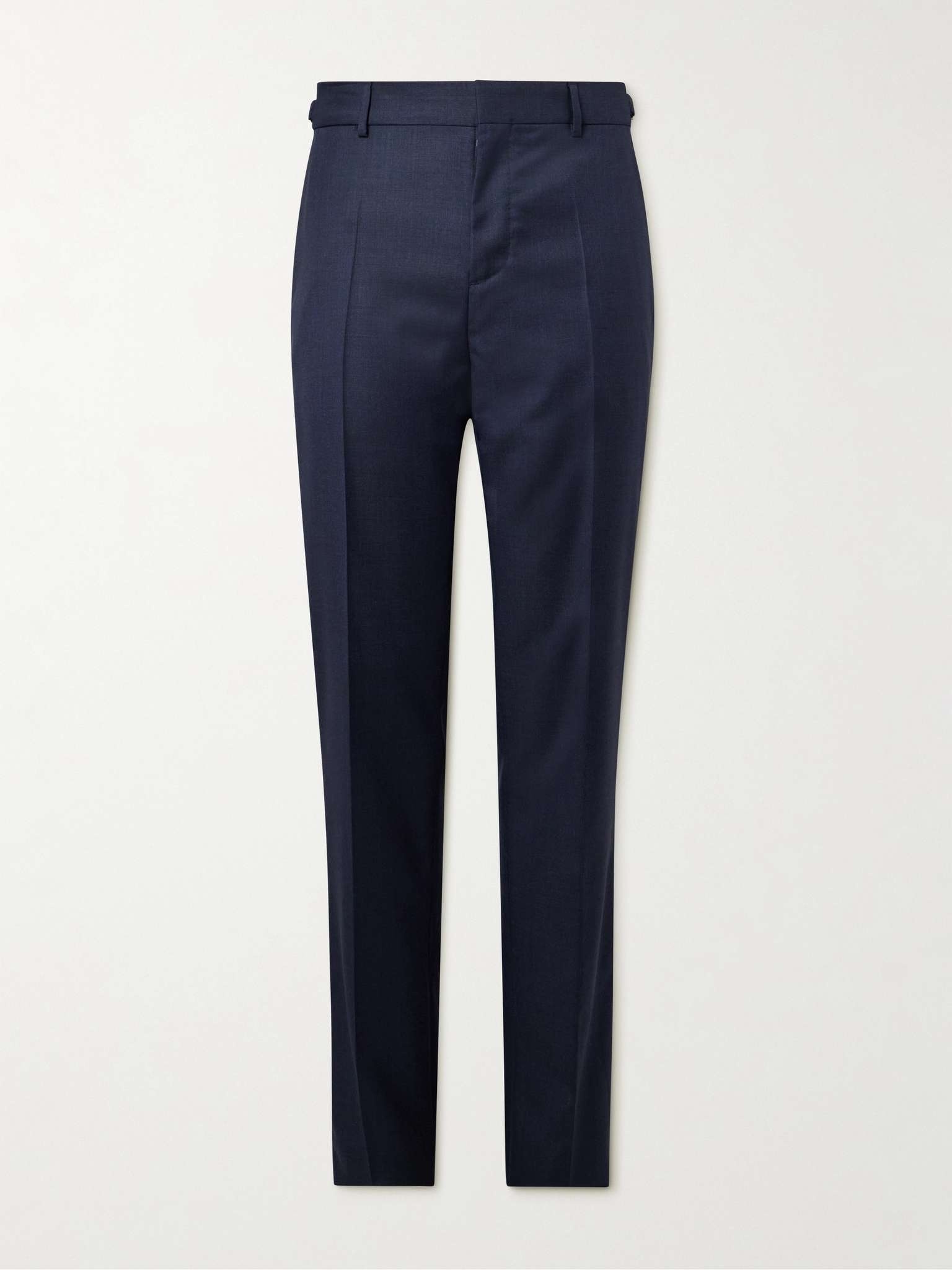 There's a certain je ne sais quoi to Versace's tailoring – the label has a way with elegance. These trousers are cut in a slim, tapered shape from virgin wool with a subtle lustre and have pressed creases through the front. If you're headed to the office, try some derbies, and for a party add some penny loafers Size & Fit - Fits true to size. Take your normal size - Slim-tapered leg, mid-rise style - Mid-weight, non-stretchy fabric - Model is shown wearing an IT48 - Model measures: waist size 32, height 6'0"/ 183cm Details & Care - Navy virgin wool - Hook, button and zip fastenings - 100% virgin wool - Dry clean