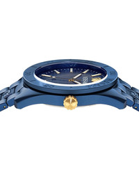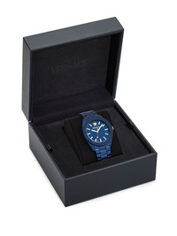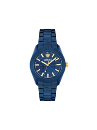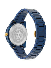 Dome 42mm Highlights - 42mm - Blue - Aluminium - Round face - Guilloche dial - Geometric dial - Medusa head motif - Baton hands - Quartz movement - Screw-down crown - Adjustable link bracelet - Folding clasp - This item comes with a standard one-year warranty from the boutique. Imported Composition Sapphire Crystal 100%, Aluminium 100% SIZE & FIT Measurement DIAMETER 1.65 in(4.2 cm)