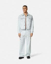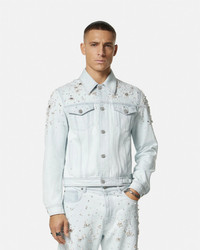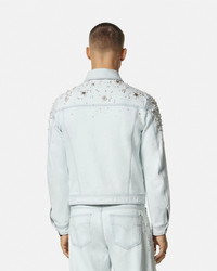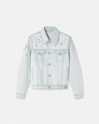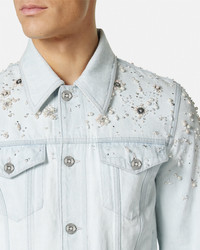 DETAILS This blouson denim jacket has a light-wash finish and is embroidered with drop pearl, beads, and metal Medusa studs throughout. - Medusa hardware - Pearl and bead embellishments - Long sleeves - Front button closure - Chest flap pockets - Side pockets - Outer composition: 100% Cotton - Lining: 100% Cupro Item: 1015083-1A10575_1D700 SIZE & FIT - The model is 1,86 m tall and wears size 48 - All sizes fit Italian standards