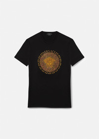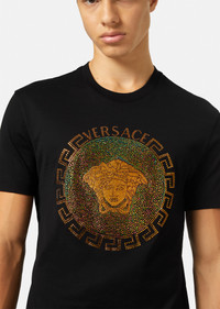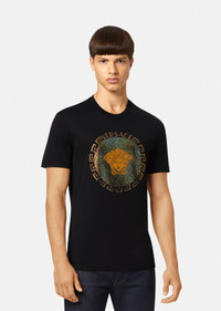 DETAILS This cotton t-shirt is crystal-embellished at the front with the Medusa motif. It has a crewneck and short sleeves. - Medusa motif - Crewneck - Outer fabric: 100% Cotton - Jersey fabric made from organic cotton - Trim: 100% Cotton - Cool iron on reverse with damp cloth on top - Do not bleach - Do not dry clean - Do not tumble dry - Dry flat - Hand wash gently using mild detergent - Wash inside out Item: 1003910-1A02780_1B000 SIZE & FIT - The model is 6'2" tall and wears a size 48 IT
