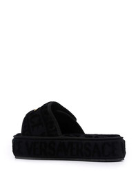 Versace Allover slippers Highlights - Black - Medusa head motif - All-over embossed logo print - Open toe - Front touch-strap fastening - Platform sole Made in Italy Composition Sole: Rubber 100% Outer: Fabric 100% Lining: Fabric 100%