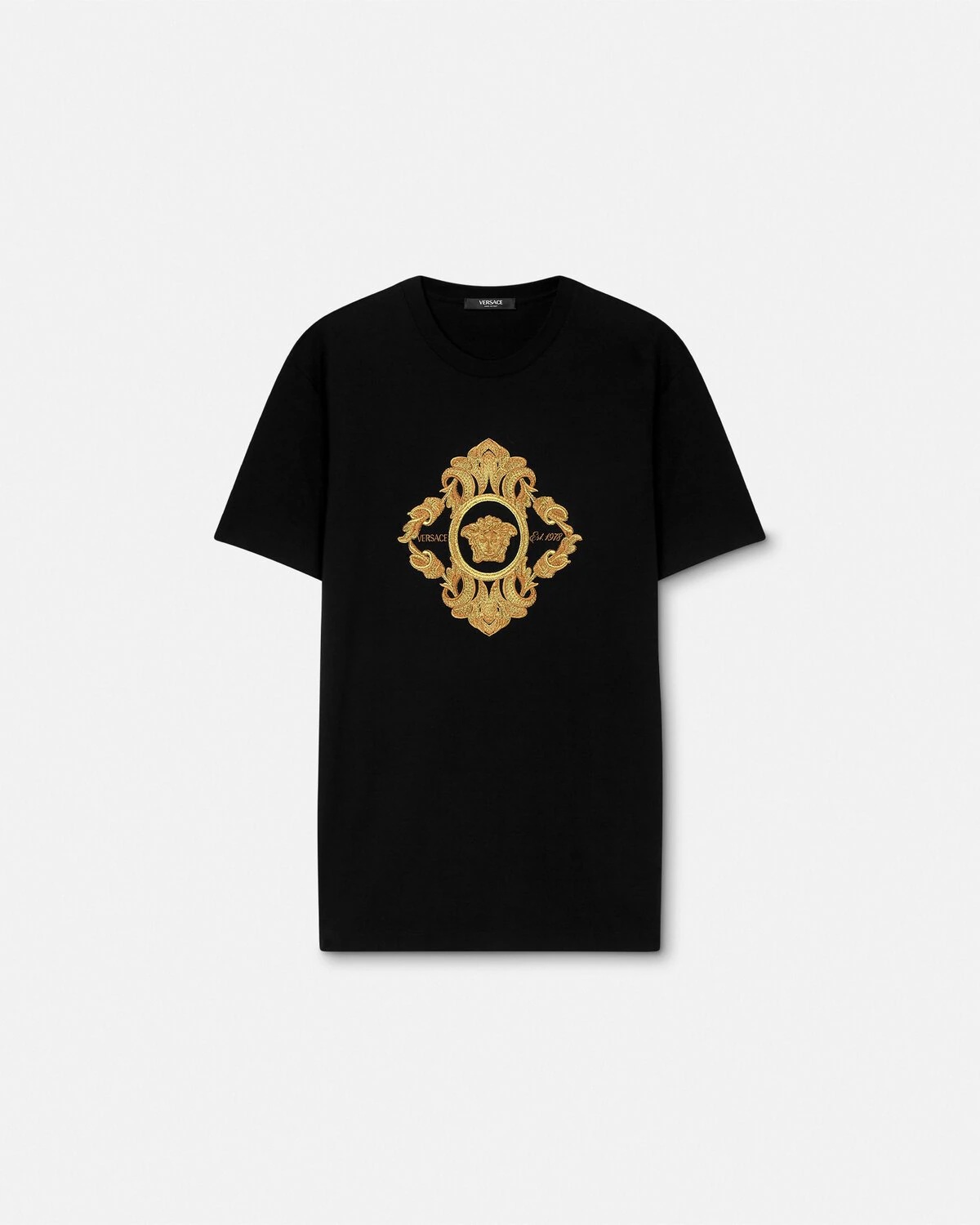 DETAILS This slimfit shortsleeved Tshirt in cotton jersey features a threadembroidered Architectural Baroque Crest motif at the front - Architectural Baroque Crest embroidery - Short sleeves - Crewneck - Outer composition: 100% Cotton - Embroidery: 50% Polyester, 20% Metalized polyester, 17% Nylon, 13% Paper yarn - Trim 1: 100% Polyester - Trim 2: 100% Cotton Item: 1013944-1A15070_1B000 SIZE & FIT - The model is 1.86 m tall and wears size M