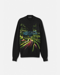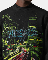 DETAILS This cableknit wool sweater features a graphic City Lights print embroidery with crystal embellishmentsrepresentative of the modernity and glamour of Hollywood with a Versace twist - City Lights embroidery - Crystal embellishments - Long sleeves - Ribbed crewneck, hem and cuffs - Outer composition: 100% Pure virgin wool Item: 1012419-1A08965_1B000 SIZE & FIT - The model is 6'2" tall and wears size 48 - All sizes fit Italian standards