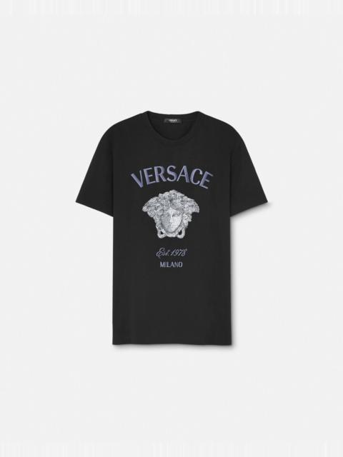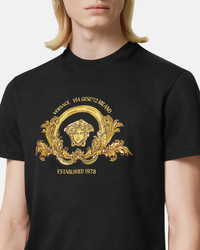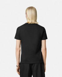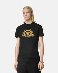 DETAILS This short-sleeved T-shirt is crafted from compact cotton jersey featuring a coat of arms Medusa embroidery with paillette embellishments and Palazzo Versace's Milanese address. - Coupe Blason embroidery - Paillette embellishments - Short sleeves - Crewneck - Outer composition: 100% Cotton - Trim: 100% Polyester - Trim: 100% Cotton Item: 1013944-1A11472_1B000 SIZE & FIT - The model is 6'1" / 1.87 m tall and wears size M