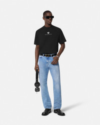 DETAILS A short-sleeved cotton T-shirt featuring a thread-embroidered Medusa and the address of Palazzo Versace in Milan. - Medusa Milano embroidery - Short sleeves - Crewneck - Outer composition: 100% Cotton - Embroidery: 100% Polyester - Trim: 100% Cotton Item: 1015738-1A11054_1B000 SIZE & FIT - The model wears size M