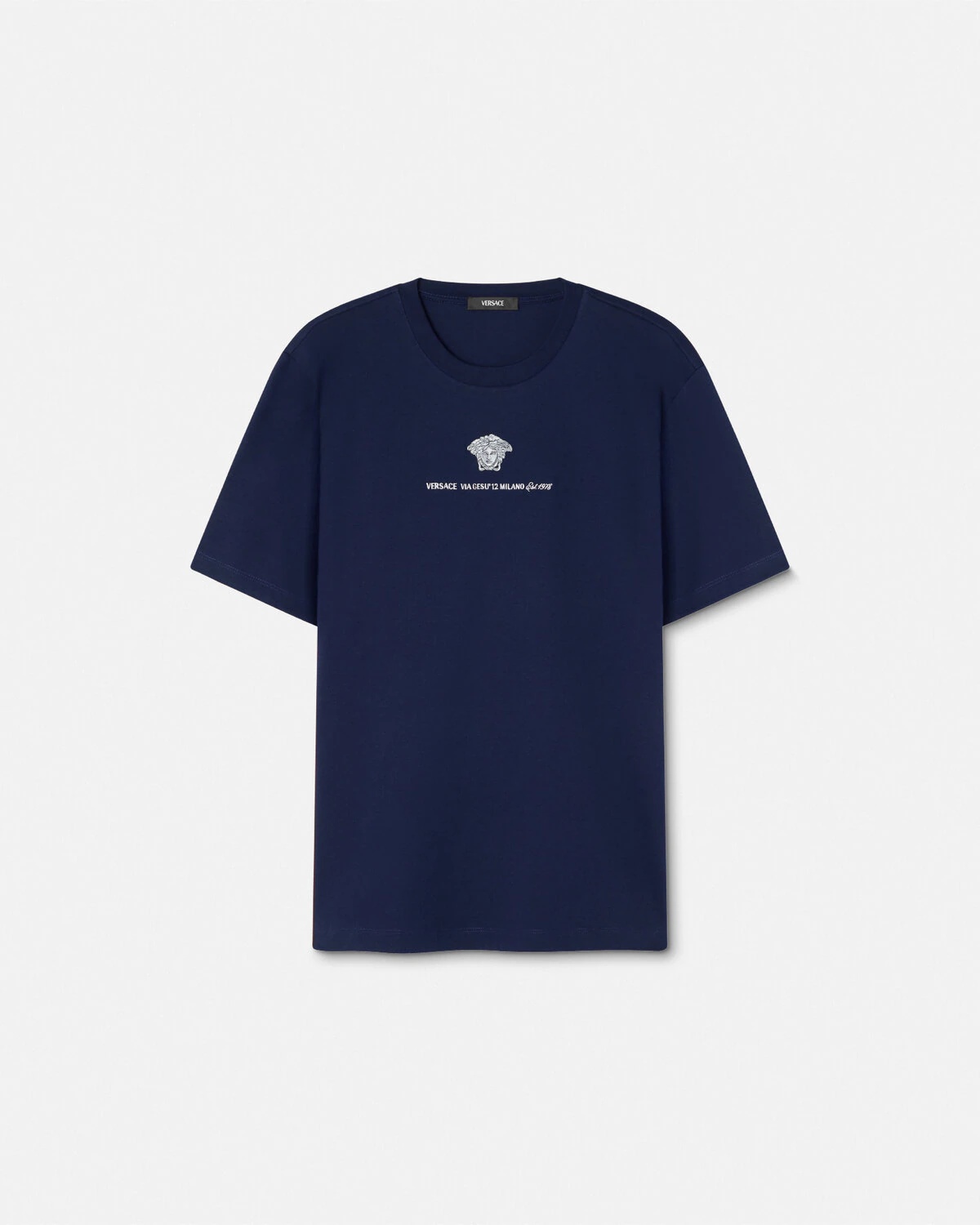 DETAILS This regularfit shortsleeved compact cotton jersey Tshirt feature a Medusa threadembroidery with the Houses founding year and address of Palazzo Versace in Milan - Medusa Milano print - Short sleeves - Crewneck - Outer composition: 100% Cotton - Embroidery: 100% Polyester - Trim: 100% Cotton Item: 1013302-1A11054_1UI20 SIZE & FIT - The model is 6'2" / 1.88 m tall and wears size M