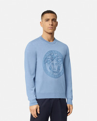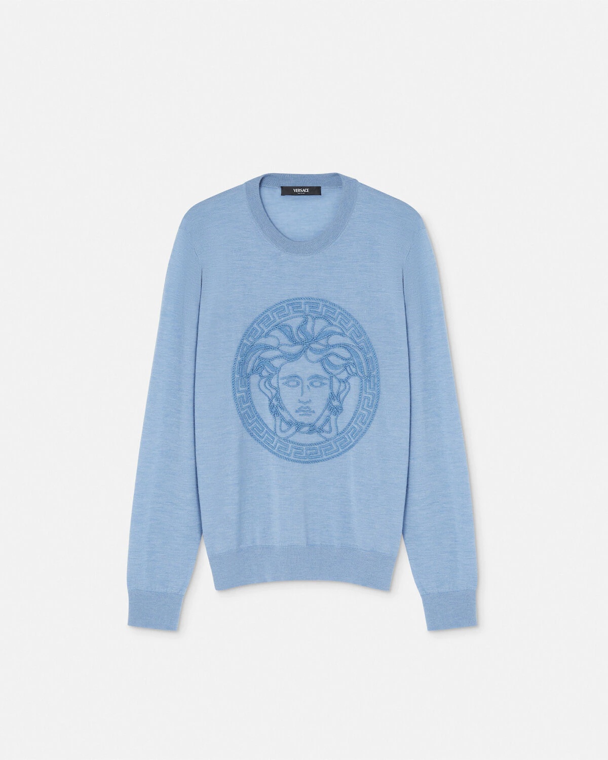 DETAILS A soft virgin wool crewneck sweater featuring a tonal Medusa embroidery with three-dimensional thread stitches. - Medusa embroidery - Long sleeves - Ribbed crewneck, hem, and cuffs - Outer composition: 100% Pure virgin wool - Embroidery: 50% Cotton, 50% Acrylic - Trim: 100% Polyester Item: 1016056-1A11251_1VD90 SIZE & FIT - The model is 6'1" tall and wears size 48 IT