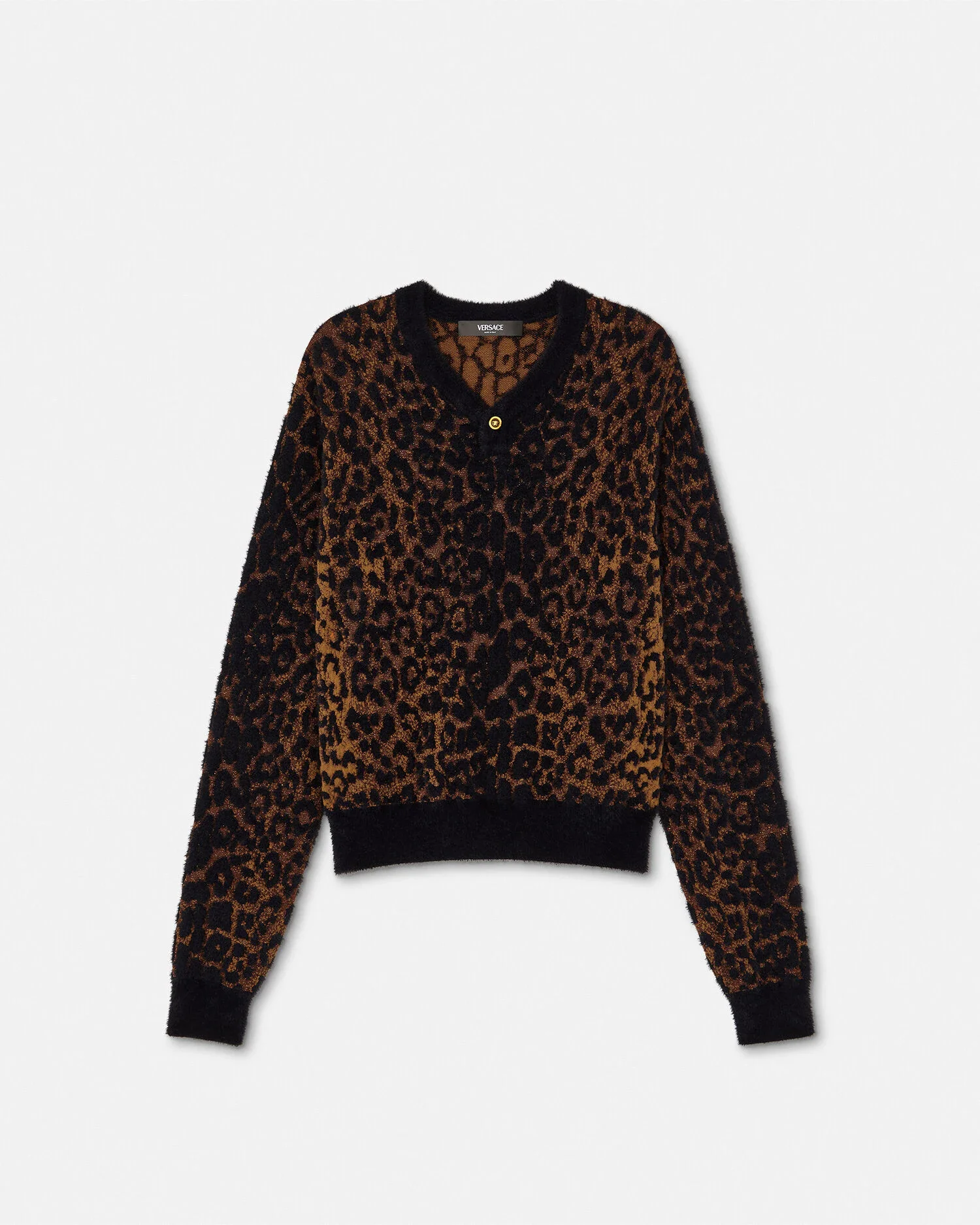 This long-sleeved knit sweater features a jacquard and chenille Leopard pattern with lurex threading and an accent enamel Medusa button. - Leopard pattern - Medusa hardware - Round neckline - Ribbed trims - Outer Composition: 68% Polyamide, 18% Cotton, 11% Viscose, 3% Polyester - Trim: 100% Polyamide Size & Fit - The model is 6'2" / 1.87 m tall and wears size 48 IT Item: 1021355-1A14893_2X630
