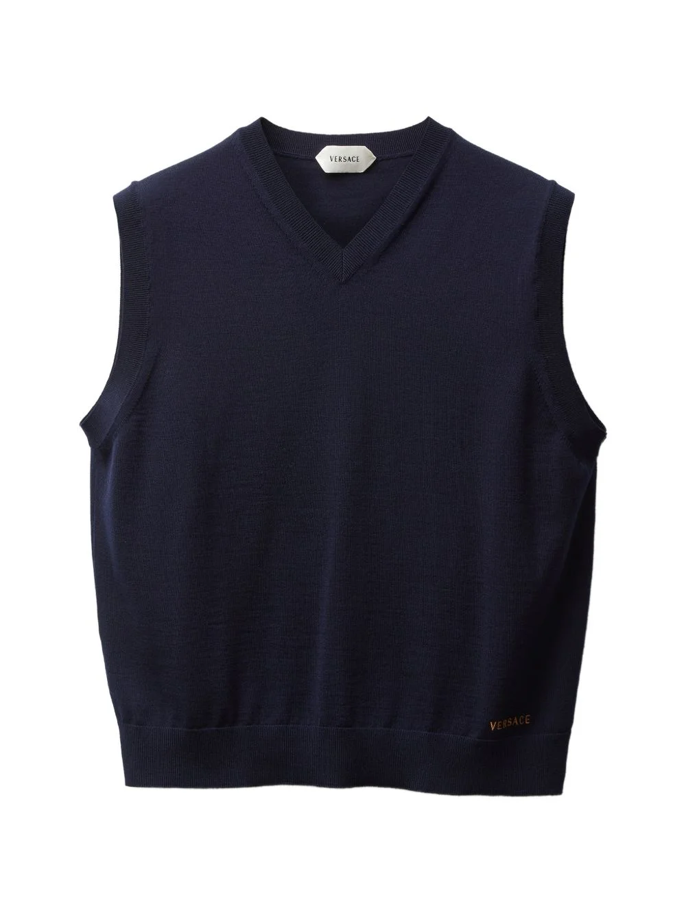 embroidered wool knit vest Highlights - A wool-knit vest featuring a small versace logo thread-embroidery. - Versace logo embroidery - Sleeveless - V-neckline - Ribbed trims - Outer composition: 99% wool, 1% other fibers - Embroidery: 100% polyester - The model wears size 46 it Made in Italy Composition Polyester 100%, Wool 99%, Other fibres 1% Washing instructions Read Manufacturer Guidelines