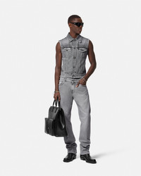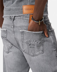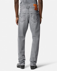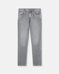 DETAILS These straight regularfit stonewashed jeans are detailed with rawcut frayed edges and a Versace Milano Stamp embroidery at the back patch pocket with the Houses founding year 1978 - Versace Milano Stamp embroidery - Belt loops - Front button and zip closure - Five-pocket design - Versace logo leather patch - Outer composition: 100% Cotton - Embroidery: 100% Polyester - Trim: 100% Calf leather Item: 1016106-1A11098_1D280 SIZE & FIT - The model is 6'1" / 1.87 m tall and wears size 32 IT