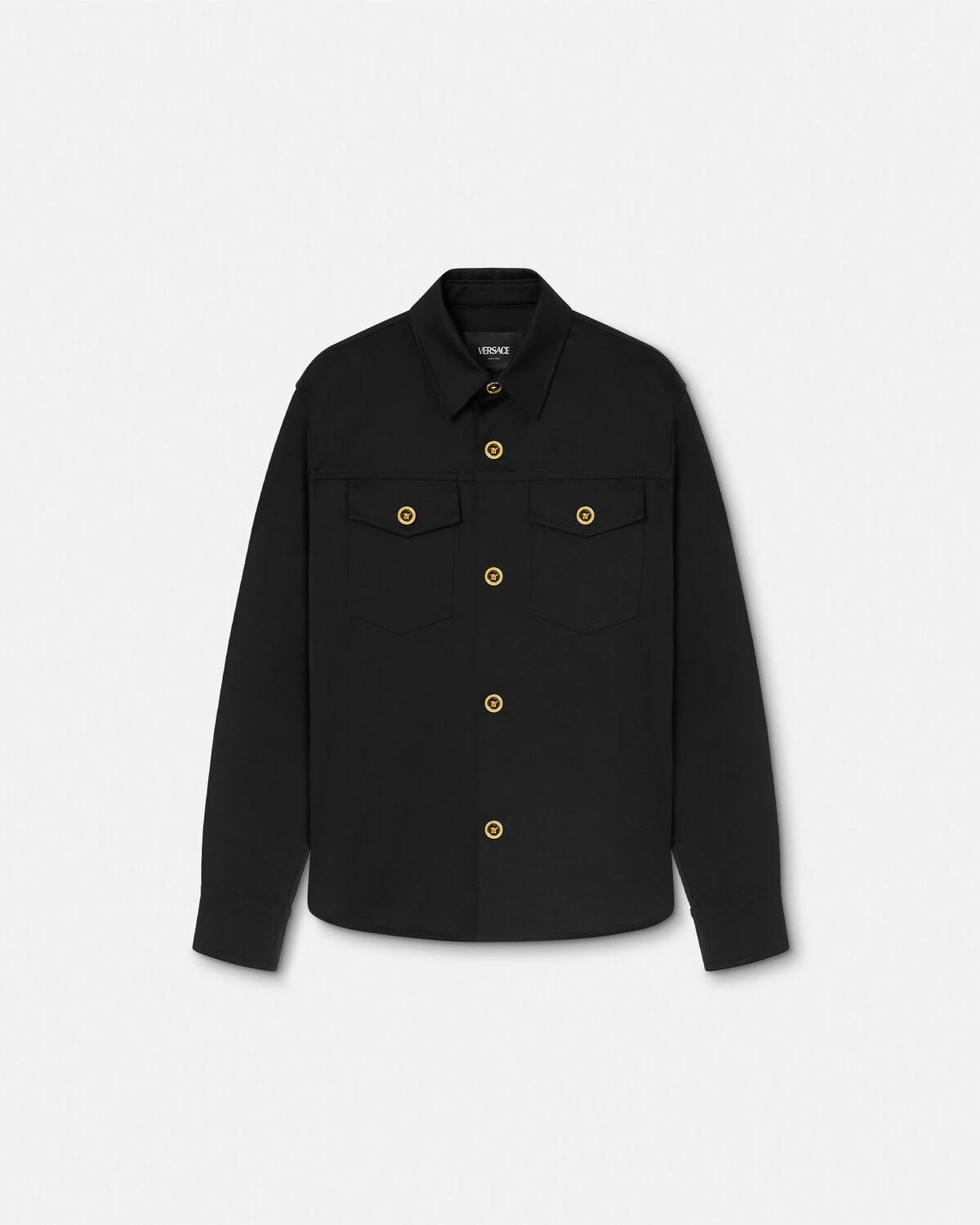 DETAILS This cotton gabardine overshirt is accented by enamel Medusa buttons and features front flap pockets - Medusa hardware - Pointed collar - Long sleeves - Front snap-button closure - Chest flap pockets - Snap-buttoned cuffs - Outer composition: 100% Cotton Item: 1017413-1A01718_1B000 SIZE & FIT - The model is 6'2" / 1.87 m tall and wears size 48 IT