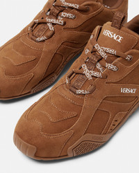 DETAILS This innovative shoe combines the agility of a boxing shoe with the power of a racing shoe Its thin versatile rubber outsole features a repeated Greca pattern The sleek last ensures a comfortable fit while suede uppers provide flexibility and structure - Galaxia Logo on insole - Versace Logo embossing on tongue and heel counter - Greca motif on outsole - Greca pull tab on tongue - Low-top - Lace-up - Round toe - Trim: 100% Calf leather - Sole: 100% Rubber Item: 1017878-1A15427_1NI00 SIZE & FIT - The shoe weighs approximately 14.1 oz / 0.4 kg for the model size 44 IT - Footbed: slim - Fits true to size, take your normal size
