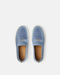 DETAILS These suede loafers are enriched with a Greca motif on the front and Versace Logo hardware - Versace Logo hardware - Medusa hardware - Greca motif - Round toe - Penny loafer strap - Outer composition: 100% Calf leather - Lining 1: 100% Calf leather - Lining 2: 100% Goat leather - Sole: 100% Rubber Item: 1017591-1A14340_1VF0V SIZE & FIT - The shoe weighs approximately 21.2 oz / 0.6 kg for the model size 42 IT - Heel: 1.2" / 3 cm - Footbed: regular - Fits true to size, take your normal size