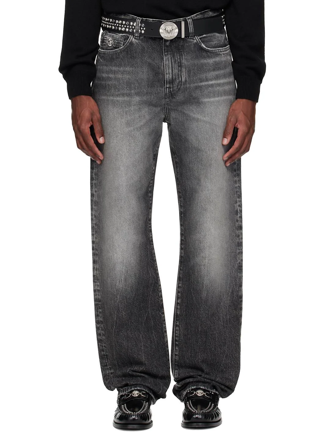 Stonewashed non-stretch denim jeans. · Fading and whiskering throughout · Loose-fit · Belt loops · Five-pocket styling · Zip fly · Medusa hardware at coin pocket · Logo patch at back waistband Supplier color: Gray 100% cotton. Made in Italy 261404M186002