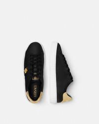 The low-top silhouette is characterized by an engraved Greca pattern on the soles and features a Medusa Biggie hardware on the uppers. A Versace Logo stamp on the back accents the style. Greca sneakers are made using responsible materials with certified recycled content and/or are derived from renewable origin. - Medusa Biggie hardware - Versace Logo patch at the tongue - Versace Logo at the heel counter - Low top - Lace up - Outer composition: 100% Calf leather - Lining: 100% Polyester - Trim: 100% Nylon - Sole: 100% Thermoplastic polyurethane Size & Fit - The shoe weighs approximately 17.7 oz / 0.5 kg for the model size 44 IT Item: 1014460-1A14957_2B130