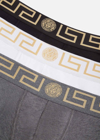 Stretch cotton trunks featuring an elasticized Greca waistband with a central Medusa motif. DETAILS & CARE - Elasticized Greca waistband - Outer fabric: 94% Cotton, 6% Elastane - Gusset: 94% Cotton, 6% Elastane - Trim: 81% Polyester, 17% Elastane, 2% Nylon - Hand wash gently using mild detergent - Delicate dry clean - Do not bleach - Do not tumble dry - Do not iron - Made in Italy SIZE & FIT - All sizes fit Italian standards - Pack of three
