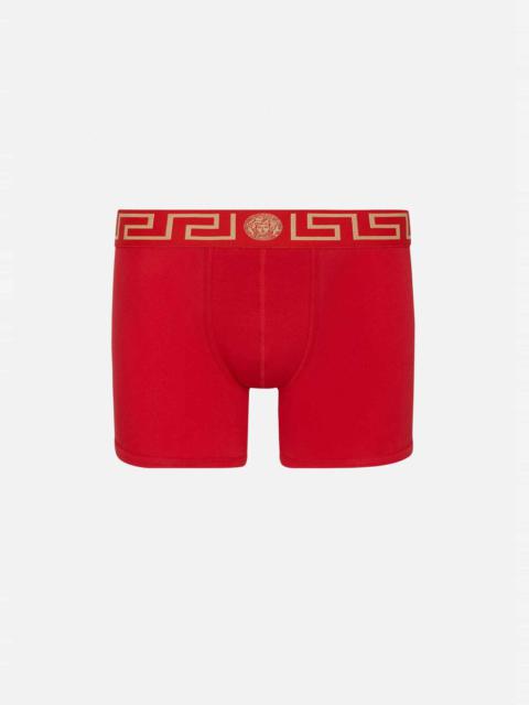 Cotton trunks featuring an elasticized waistband with the Greca and a central Medusa motif. DETAILS & CARE - Outer Fabric: 94% Cotton, 6% Elastane - Gusset: 94% Cotton, 6% Elastane - Trim: 81% Polyester, 17% Elastane, 2% Nylon - Do not iron - Delicate dry clean - Hand wash gently using mild detergent - Do not bleach - Do not tumble dry SIZE & FIT - All sizes fit Italian standards