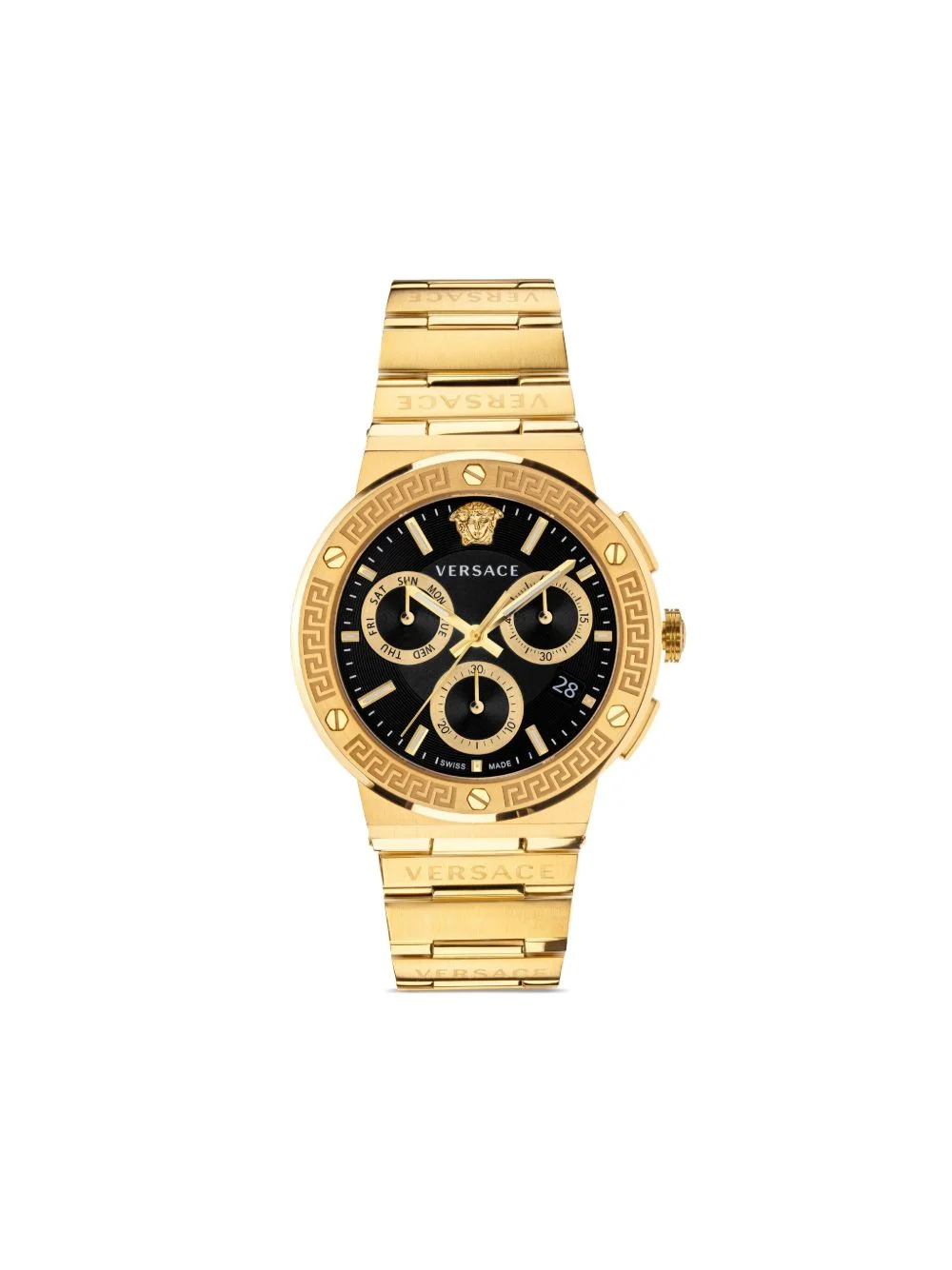 Greca Chrono 43mm Highlights - Gold-tone - Round case - Sapphire crystal - Black dial - Chronograph subdials - Greca bezel - Swiss quartz movement - Screw-in crown - Water resistance up to 50m/5 atm Imported Composition Sapphire Crystal 100%, stainless steel 100% SIZE & FIT Measurement DIAMETER 1.69 in(4.3 cm)