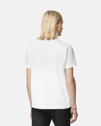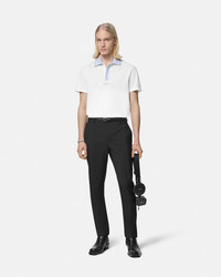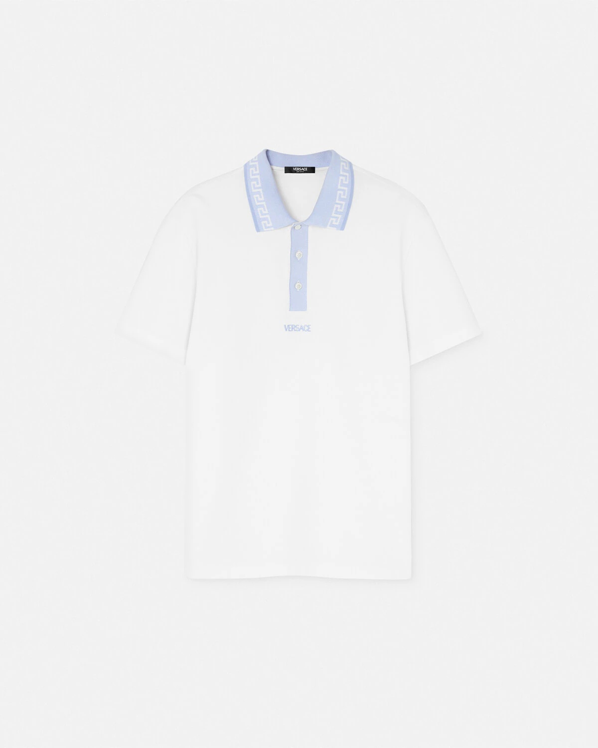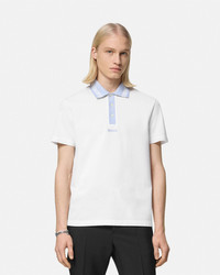 DETAILS This short-sleeved polo shirt is crafted from cotton piqué featuring a ribbed Greca collar and a Versace embroidery at the front. - Versace logo embroidery - Greca motif - Short sleeves - Pointed collar - Three-button placket - Outer composition: 100% Cotton - Embroidery: 100% Viscose - Trim 1: 100% Polyester - Trim 2: 100% Cotton Item: 1013906-1A11278_1W010 SIZE & FIT - The model is 6'1" tall and wears size M