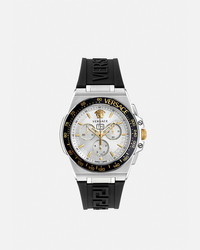 DETAILS A chronograph watch featuring date and day indicators at 6h and 12h respectively. The dial is adorned by the iconic Greca motif, 3D Medusa, and Versace logo at 12h. The Versace logo is inserted in the tachymeter on the top ring. The timepiece is completed with a Greca embossed silicone band. All Versace watches are guaranteed by the 'Swiss Made' marking. - Case: Stainless Steel case with Aluminium top ring - Dial: White-Silver dial with Versace logo and Medusa at 12h / Greca on the inner ring - Bracelet: Black silicon strap with 3D Versace logo at 12h and Greca 3D at 6h / butterfly buckle - Movement: RONDA 5040.E Swiss Quartz Chrono movement / date at 6h and weekday at 12h - Water Resistant: 5 ATM Item: PVE7H001-P0023_RTU_TU_PNUL__ SIZE & FIT - Case: 1.8"