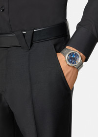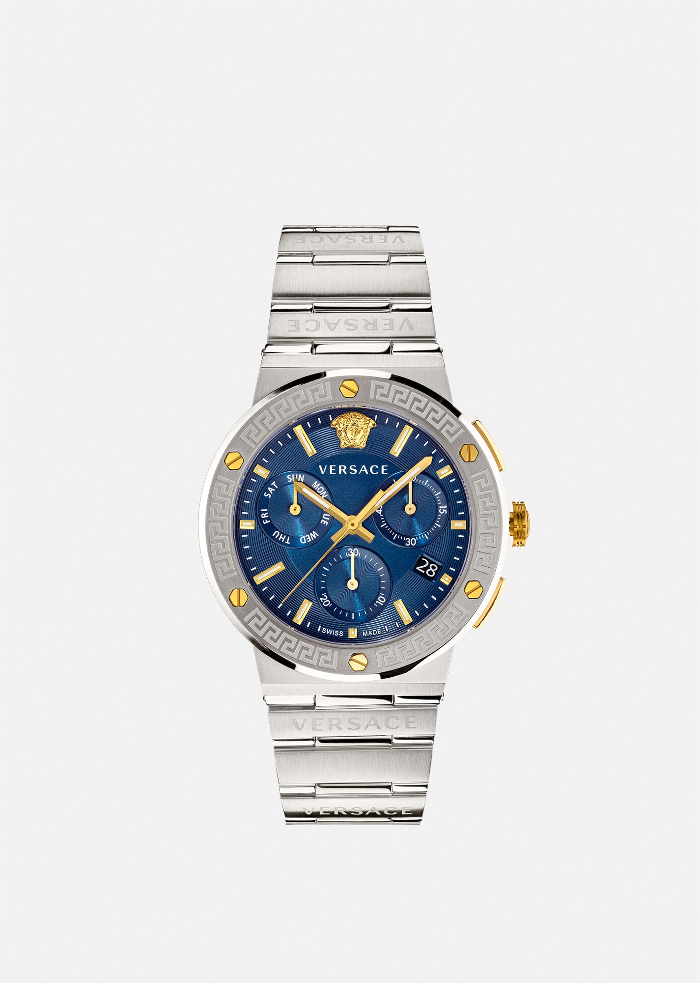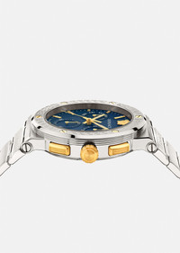 The Greca Logo timepiece features a stainless steel band composed of alternating logo links. The Greca pattern is engraved along the top ring and the dial features the emblematic Medusa at the 12 o'clock position. DETAILS & CARE - Case: Stainless steel round case with screws and Greca engraved on top ring - Dial: Blue dial with Medusa and Versace logo at 12h - Bracelet: Metal band with Versace logo on alternate links and butterfly buckle - Movement: RONDA Z60 Swiss Chrono Quartz movement with day at 9h and date at 4h - Water resistant: 5 ATM SIZE & FIT - Case: 1'7" inches