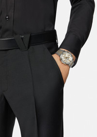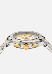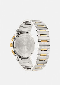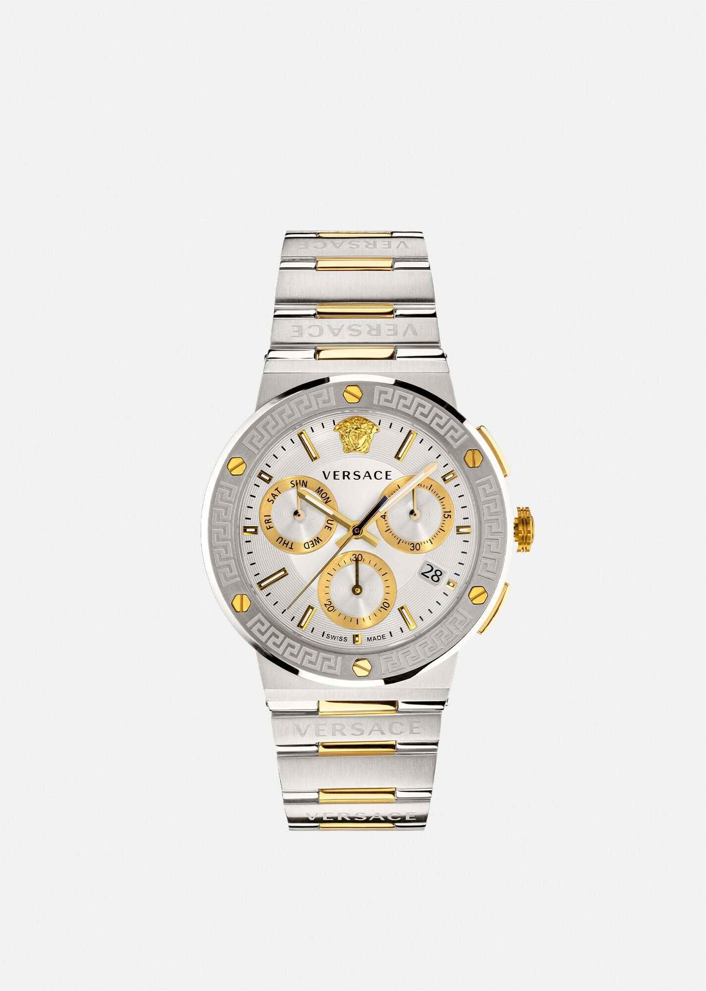 Bold and modern, the Greca Logo timepiece boasts a stainless steel band composed of alternating logo links. A Medusa at the 12 o'clock position featured alongside gold toned accents gives the timepiece an emblematic design. The Greca pattern is engraved along the top ring with a cool grey dial. DETAILS & CARE - Case: Stainless steel round case with screws and Greca engraved on top ring - Dial: Cool Grey dial with Medusa head and Versace logo at 12h - Bracelet: Metal band with Versace logo on alternate link and butterfly buckle - Movement: RONDA Z60 Swiss Chrono Quartz movement with day at 9h and date at 4h - Water resistant: 5 ATM SIZE & FIT - Case: 43mm