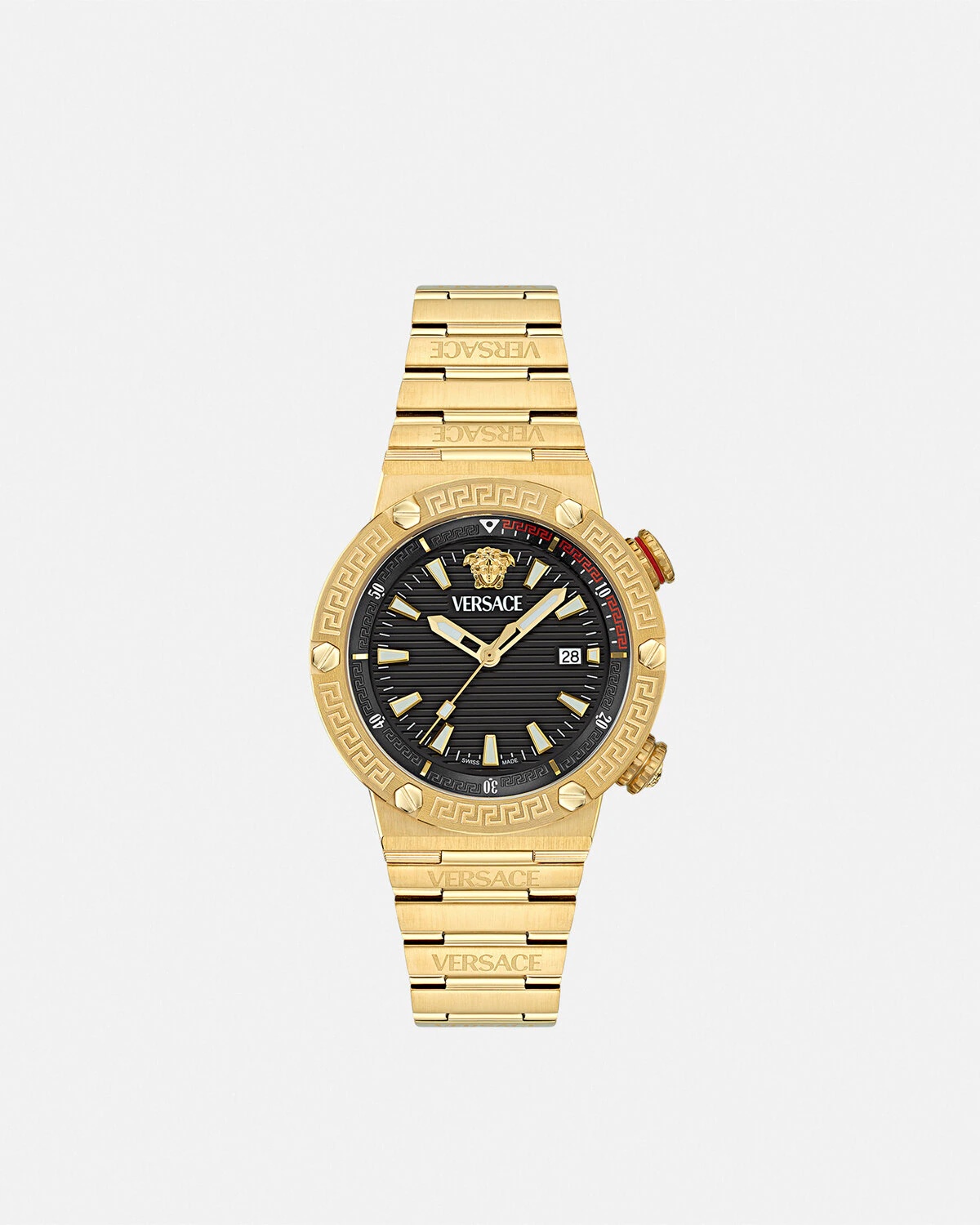 DETAILS A luxurious, sporty timepiece combining geometric shapes and iconic brand details. The top ring is marked by a Greca motif and the dial features the Versace logo at 6 o'clock and a Medusa at 12 o'clock. The design is complete with a colourful accent. All Versace watches are guaranteed by the 'Swiss Made' marking. - Case: IP2N case / Greca motif and screws on top ring - Dial: Black dial with Versace logo and Medusa at 12h - Bracelet: IP2N bracelet with butterfly buckle - Movement: RONDA 715 Swiss Quartz 3 hands-movement / Date at 3h - Water Resistant: 10 ATM Item: PVE8G006-P0024_RTU_TU_PNUL__ SIZE & FIT - Case: 1.7"