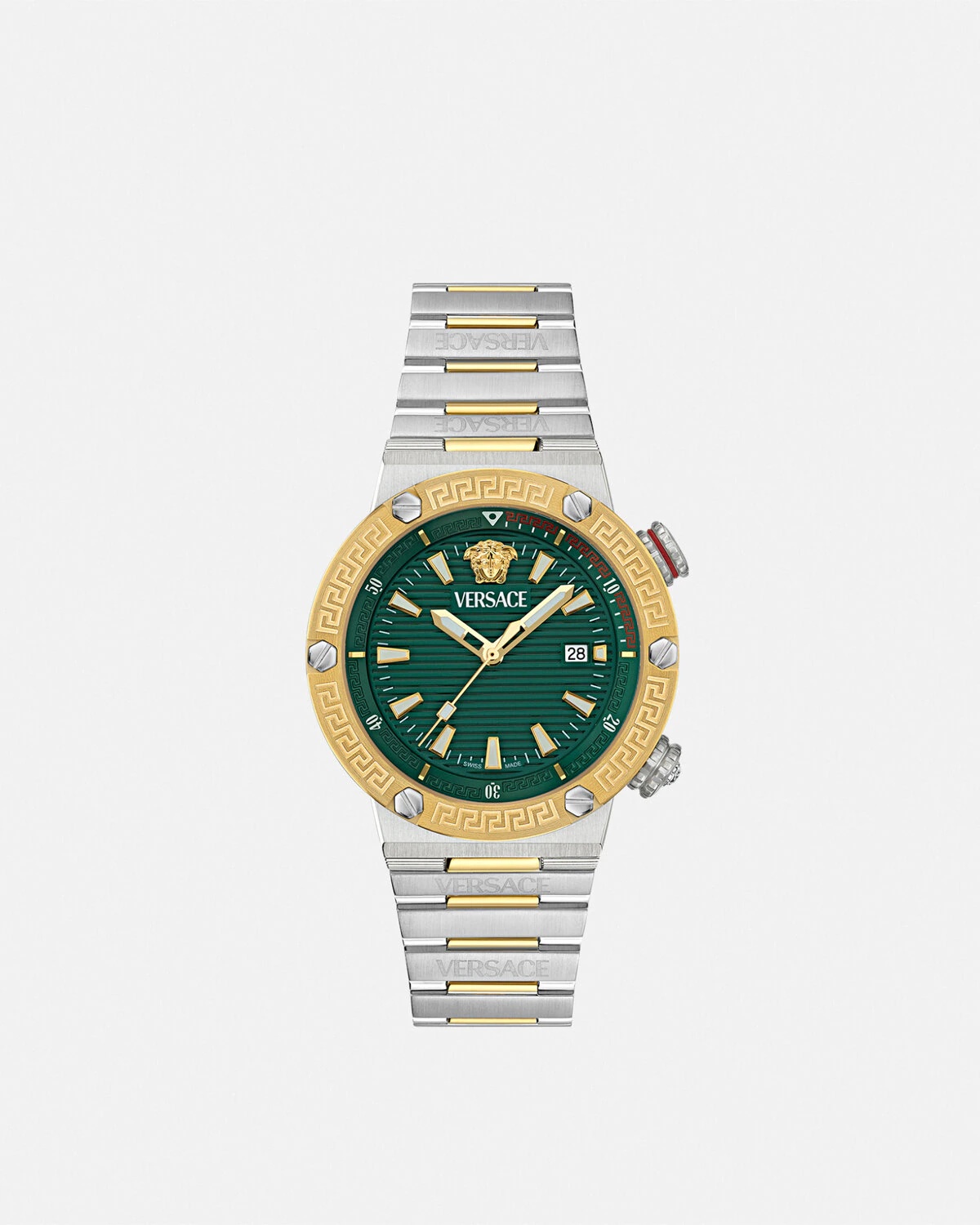 DETAILS Item: - Case: Bicolor (SS&IP2N) case / Greca motif and screws on top ring - Dial: Green dial with Versace logo and Medusa at 12h - Bracelet: Bicolor (SS&IP2N) bracelet with butterfly buckle - Movement: RONDA 715 Swiss Quartz 3 hands-movement / Date at 3h - Water Resistant: 10 ATM Item: PVE8G005-P0024_RTU_TU_PNUL__ SIZE & FIT - Case: 1.7" / 43 mm
