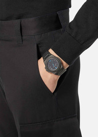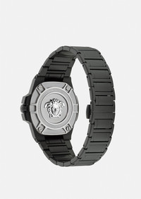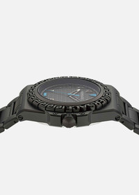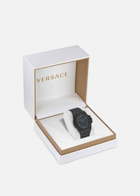 A matte, masculine timepiece equipped with chrono movement and a three-counter dial. The ring is detailed with an engraved Greca pattern and Versace lettering all-around, while the dial features a window date located at three o'clock and a tonal, all-over Greca motif. The metal band is finished with a butterfly closure and pushers. DETAILS & CARE - Case: 44 mm IP Black round case with a Greca pattern and Versace logo at the ring - Dial: Black dial with Roman and Arabic indexes and all-over Greca motif - Bracelet: IP Black metal band with butterfly buckle and pushers - Movement: RONDA 515 Swiss Quartz 3-hands movement - Water Resistant: 5 ATM SIZE & FIT - Case: 44 mm