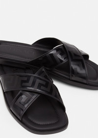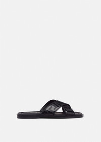 These open-toe sandals are made entirely from leather, featuring crisscross straps with a tonal Greca pattern in a lustrous patent finish. A logo stamp appears on cushioned insoles. DETAILS & CARE - Greca - Crisscross straps - Logo - Outer fabric: 100% Calf Leather - Lining: 100% Calf Leather - Sole: 100% Calf Leather SIZE & FIT - Fits true to size, take your normal size - All sizes fit Italian standards
