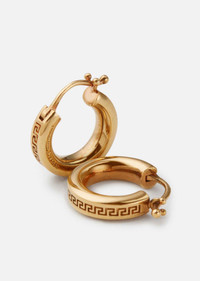 Discrete and elegant, these small hoop earrings are a perfect finishing touch to a multitude of looks. The understated design is enriched with an engraved Greca pattern. All Versace Jewelry items are lead and nickel free. All materials are hypoallergenic. DETAILS & CARE - Engraved Greca - For pierced ears - Metal: Brass - Finish: Tribute Gold - Please note water and perfume may damage the item - Made in Italy SIZE & FIT - Width: 1,5 cm