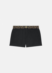 An iconic Versace design, these short swim shorts are emboldened with the instantly recognizable Greca elasticized waistband. The swim style pairs perfectly with classic Versace sunglasses.This style includes a pocket with a snap button closure. DETAILS & CARE - Greca elasticized waistband - Outer fabric: 100% Polyester - Lining: 88% Polyester 12% Elastane - Trim: 82% Polyester 9% Elastane 9% Nylon - Hand wash gently using mild detergent - Do not bleach - Do not tumble dry - Do not iron - Delicate dry clean SIZE & FIT - All sizes fit Italian standards - The Model is 1,86 m tall and wears a size 3