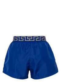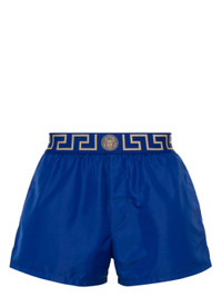 blue/gold-tone lightweight elasticated logo waistband with signature Greca detailing and Medusa Head motif two side inset pockets full lining slip-on style Be mindful to try on swimwear over your own garments. Size & Fit Model Measurements: Bust: 0cm Height: 0cm Hips: 0cm Waist: 0cm Fabric and Care Designer Style ID: ABU010221A11120 Designer Colour: A85K BLUETTE GOLD Composition: Outer: Polyester 100%; Lining: Polyamide 94%, Elastane 6% Washing instructions: Hand Wash Made in Italy